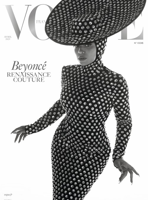 On the Vogue France cover, Beyoncé wears a shouldered dress and thermoformed black velvet hat set with rhinestones. When posting the cover on Instagram, she included lyrics from “I’m That Girl,” the opening track on Renaissance: “Touching everything in my plain view, and everything next to me gets lit up, too.”