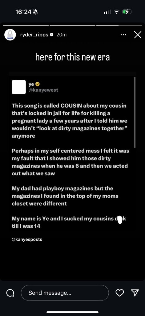 In an upcoming song entitled ‘COUSINS’, Ye proclaims to have performed oral sex on his male cousin starting at the age of 6 until he was 14!!!
